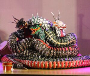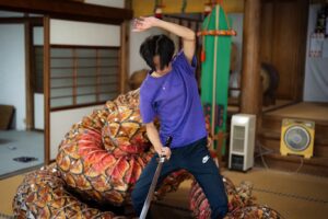 今回の神楽上演で特に注目を集めたのは、女子生徒の一人が初めて”大蛇(おろち)”の役に挑戦したことです。