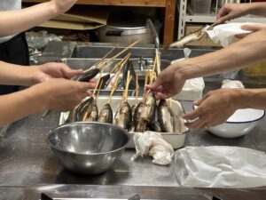 鮎の塩焼きの準備をしました(初めて串を刺す体験をしました)!