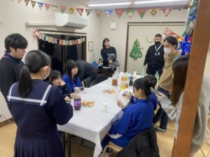 クリスマスデコレーションやお菓子で彩られた会場に、学校や部活動帰りの生徒たちが続々と到着し、もうすぐ始まる冬休みへの期待感と、放課後のリラックスした雰囲気が重なる中、私たちみらい共創コーディネーターも加わり、みんなで特別な時間を共有しました。