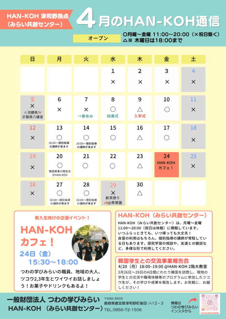 津和野拠点では、4月24日(金)にHAN-KOHカフェを開催します。中学校や高校の新入生のみなさんともたくさん繋がれる場にしたいと思っています。