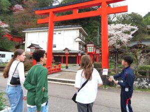 また、まち案内では、部員が英語でカトリック教会や太皷谷稲成神社などについて説明しました。資料を見ながらではありましたが、活動の中で練習してきたフレーズを使ったりと、普段の会話練習の成果を発揮でき、生徒の自信にもつながったようです。